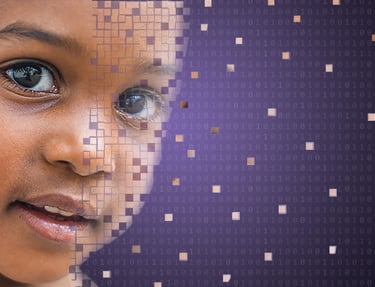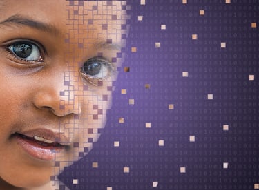 The imagery depicting pixelated individuals arises from the notion that data denotes real people, showcasing how disparate data can coalesce to represent individuals and their experiences.